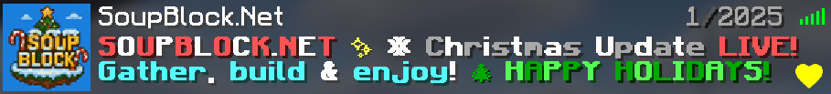 SoupBlock is a brand-new SkyBlock community with an active and dedicated staff team determined to grow the server to its full potential. The server is currently in beta — bugs may occur, but they are fixed quickly with frequent updates and player feedback.